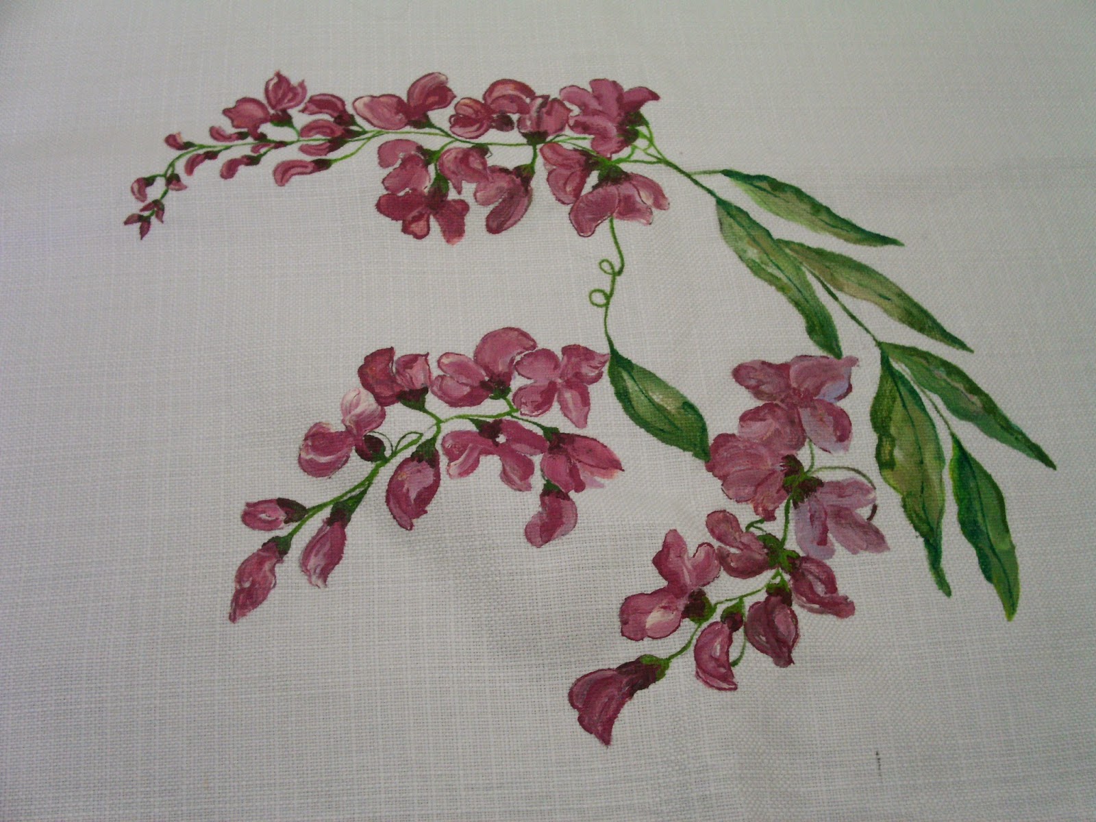 Ed eccovi ancora, care amiche, un lavoro fatto da Adriana. Questa volta ha dipinto un bel tralcio di glicine sui 4 angoli di una tovaglietta. La rifinitura all'uncinetto è stata fatta da Andreana. È bellissima e, vista di persona, è ancora più bella.